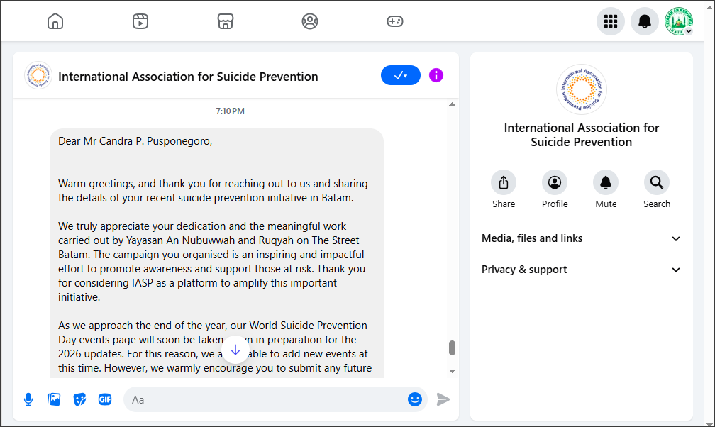 “Kami sangat menghargai dedikasi Anda dan pekerjaan bermakna yang dilakukan oleh Yayasan An Nubuwwah dan Ruqyah on The Street (RoS) Batam. Kampanye yang Anda selenggarakan merupakan upaya yang menginspirasi dan berdampak besar dalam meningkatkan kesadaran dan memberikan dukungan bagi mereka yang berisiko,” tulis IASP dalam pernyataan resminya, Rabu (10/12/2025).