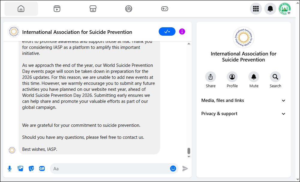 Sebagai lembaga internasional yang setiap tahun memimpin kampanye World Suicide Prevention Day (WSPD), IASP menyampaikan bahwa halaman acara resmi mereka sedang ditutup untuk persiapan pembaruan menuju agenda 2026. Karena itu, mereka belum dapat memasukkan kegiatan ruqyah akbar Jembatan I Barelang ke dalam daftar program tahun 2025.